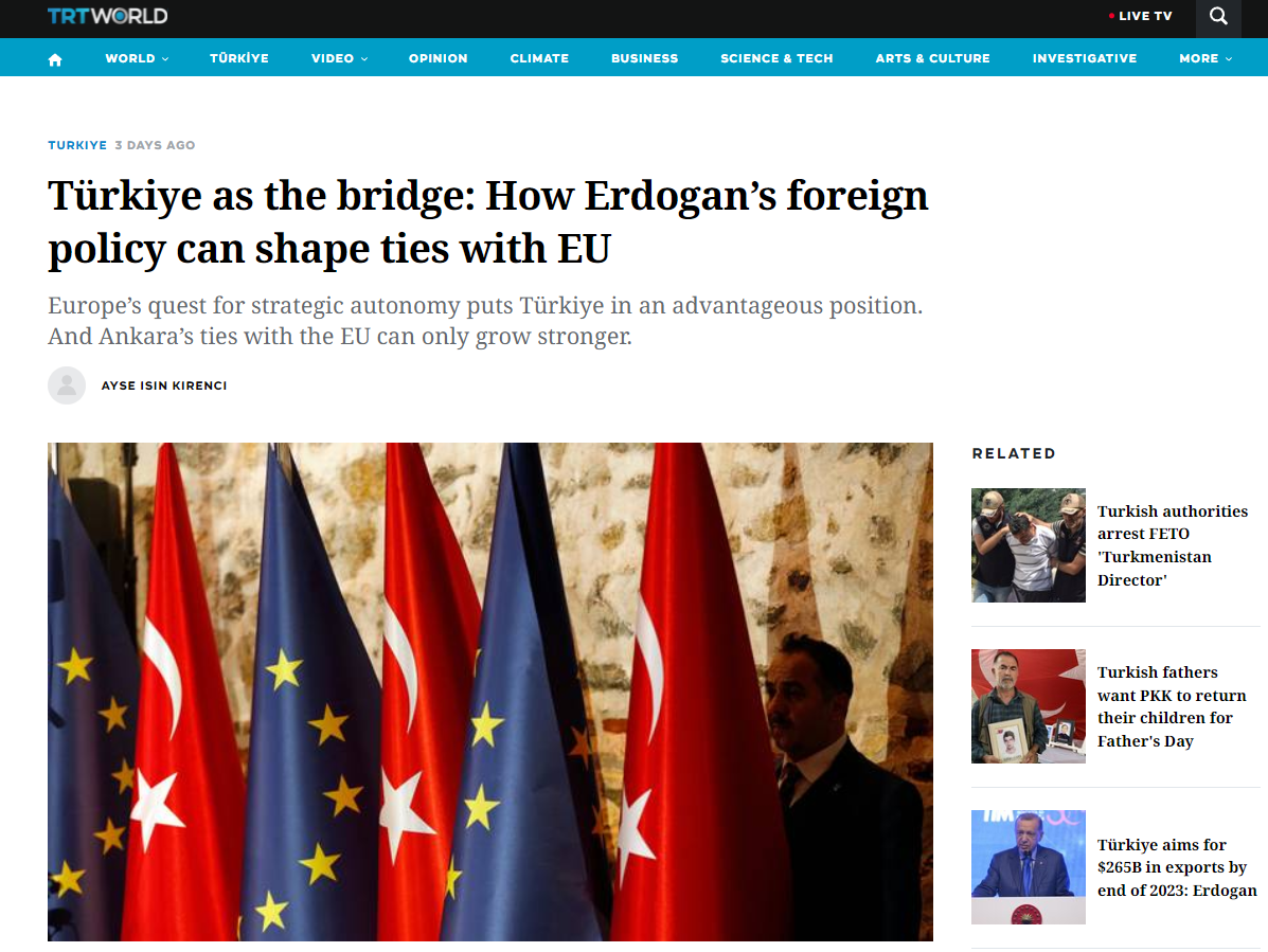 Профессор д-р Мехмет Сейфеттин Эрол, директор Анкарского центра кризисных и политических исследований (ANKASAM), дал TRT World оценку отношениям Турции с ЕС. Комментируя этот вопрос, Эрол сказал: «Турция геополитически расположена в точке, где встречаются Европа и Азия. На данный момент можно сказать, что геополитическое значение Турции еще больше возросло после российско-украинской войны. В частности, блокирование Северного коридора из-за войны сделало Центральный коридор как никогда важным с точки зрения энергетики и логистики для поддержания связи между Китаем и Европой. Известно, что Анкара с самого начала не хотела этой войны и хотела, чтобы она закончилась как можно скорее. Учитывая успех Турции в «Зерновом коридоре», ее роль в соединении Китая и Европы в контексте «Центрального коридора» и, наконец, ее усилия стать энергетическим хабом, видно, что Турция проводит конструктивную политику перед лицом региональных и глобальных кризисов. По сути, этот успех является результатом сбалансированного, многостороннего дипломатического подхода Турции». В этом контексте Эрол заявил, что в отношениях между Турцией и ЕС может быть открыта новая страница.