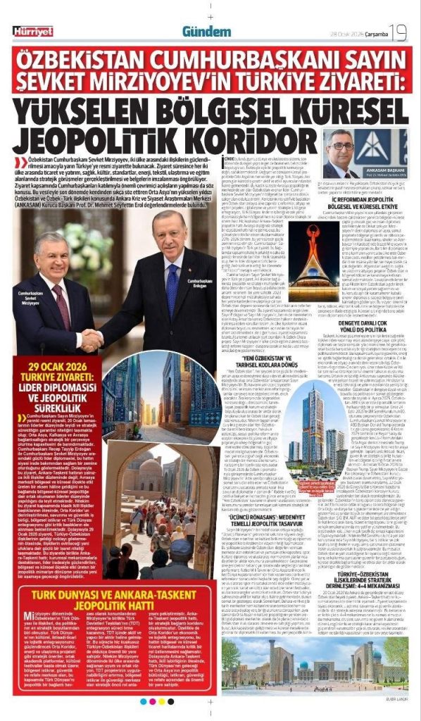 Официальный визит Президента Республики Узбекистан Шавката Мирзиёева в Турцию начинается. В преддверии данного значимого события в одной из ведущих газет Турции — Hürriyet — была опубликована аналитическая статья, подготовленная Председателем Анкарского центра кризисных и политических исследований (ANKASAM), профессором, доктором Мехметом Сейфеттином Эролом.
