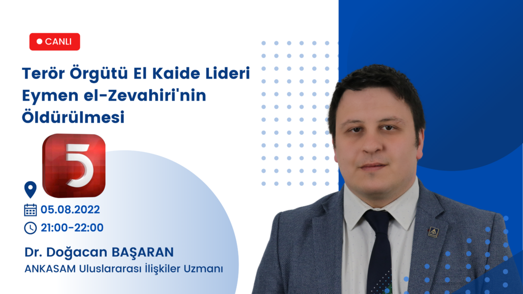 Tarih:05/08/2022Paylaş:TwitterFacebookLinkedinReddItWhatsAppTelegramEmailYazdırCopy URL DuyurularANKASAM AF-PAK Uzmanı Dr. Doğacan Başaran, TV5’teÖnerilenler Dr. Doğacan Başaran 05.08.2022 21:00-22:00 TV5Terör Örgütü El Kaide Lideri Eymen el-Zevahiri’nin Öldürülmesiİzlemek için tıklayınızÖnceki İçerikANKASAM Başkanı Prof. Dr. Mehmet Seyfettin Erol, A Haber’deSonraki İçerikANKASAM Başkanı Prof. Dr. Mehmet Seyfettin Erol, Kanal B’de