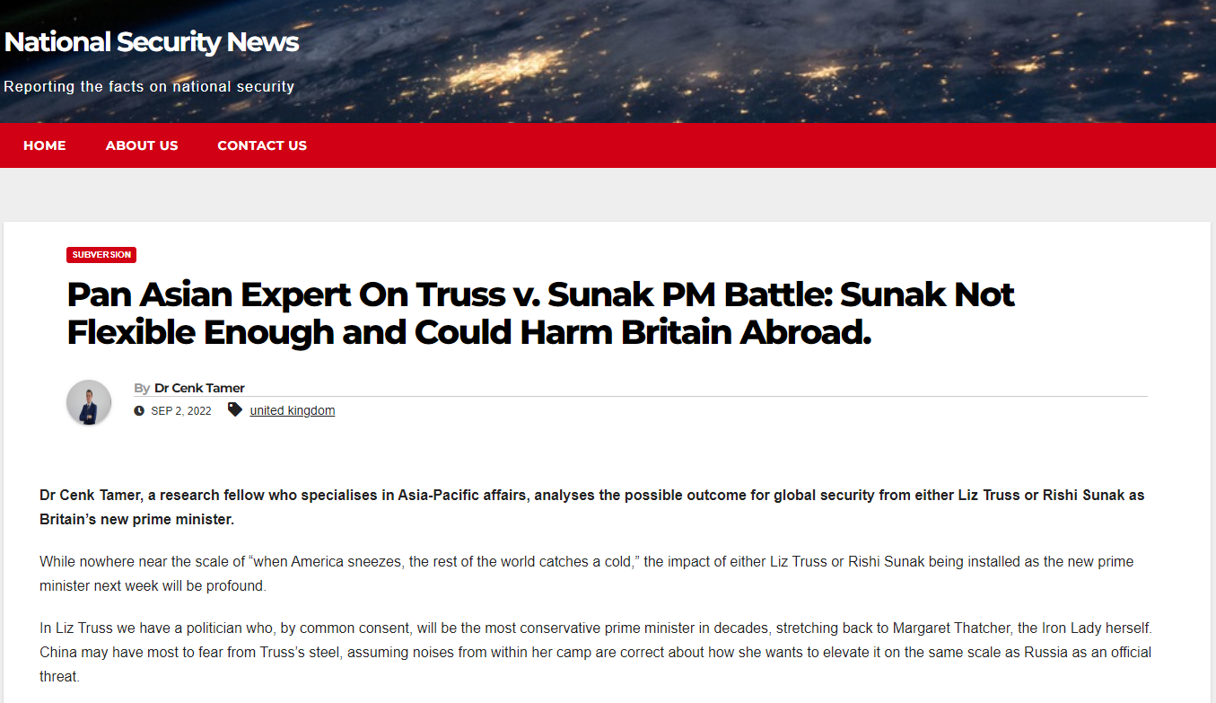 Ankara Kriz ve Siyaset Araştırmaları Merkezi (ANKASAM) Asya-Pasifik Uzmanı Dr. Cenk Tamer, İngiltere’de devam eden Başbakanlık yarışını İngiltere merkezli National Security News haber portalına değerlendirdi. Başbakan Boris Johnson’ın istifası sonrasında yerine gelecek ismin eski Maliye Bakanı Rishi Sunak ya da eski Dışişleri Bakanı Liz Truss’ın olmasının beklendiğini ifade eden Tamer, Truss’ın Dışişleri Bakanlığı görevinde bulunmuş olması sebebiyle İngiltere’nin küresel çıkarlarını yakından bildiğini ve bu yüzden favori aday olarak öne çıktığını belirtti. Tamer, Başbakanlık yarışında Maliye Bakanlığı yapmış olan Sunak’ın ise dış politikaya dair tecrübesinin olmamasından ötürü elinin zayıf olduğunu vurguladı. Tamer, “Her durumda adaylar Rusya, Çin ve Brexit başta olmak üzere İngiltere’nin küresel çıkarlarını ilgilendiren hususlarda vaatlerde bulunmaya başlamışlardır. Nihayetinde Başbakanlık koltuğundaki bu değişiklik, İngiltere’nin yalnızca AB’yle değil; aynı zamanda transatlantikle olan ilişkilerini de etkiyecektir. Bunun etkileri Asya-Pasifik’le olan münasebetlere kadar uzanacaktır.” diye konuştu.