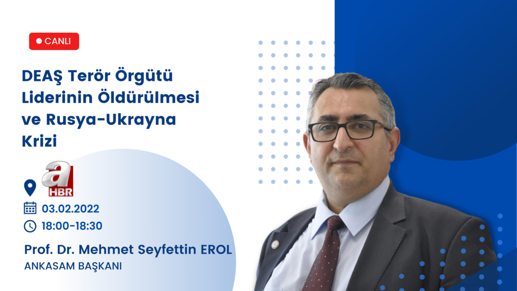 Tarih:03/02/2022Paylaş:TwitterFacebookLinkedinReddItWhatsAppTelegramEmailYazdırCopy URL DuyurularANKASAM Başkanı Prof. Dr. Mehmet Seyfettin EROL, A Haber’deÖnerilenler Prof. Dr. Mehmet Seyfettin EROL03.02.202218:00-18:30A Haber, “Akşam Ajansı”DEAŞ Terör Örgütü Liderinin Öldürülmesi ve Rusya-Ukrayna Kriziİzlemek için buraya tıklayınızÖnceki İçerikANKASAM Başkanı Prof. Dr. Mehmet Seyfettin EROL, Ulusal Kanal’daSonraki İçerikANKASAM Başkanı Prof. Dr. Mehmet Seyfettin Erol, Cumhurbaşkanı Erdoğan’ın Ukrayna Ziyaretini TVNet’e Değerlendirdi