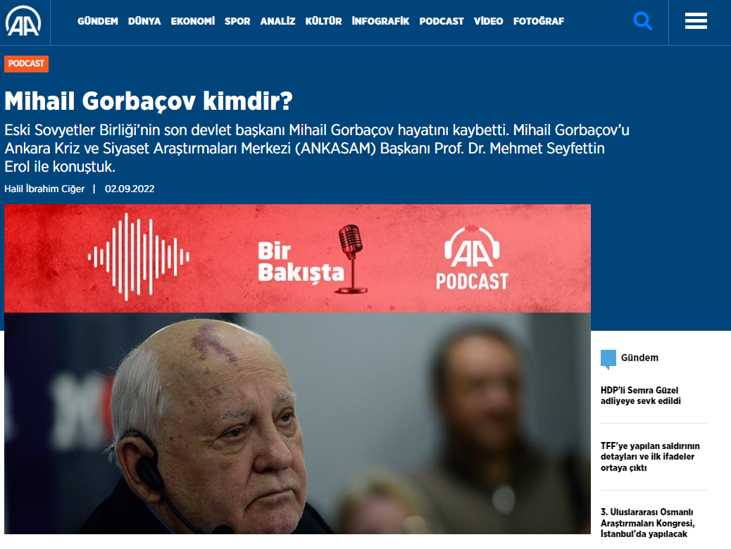Ankara Kriz ve Siyaset Araştırmaları Merkezi (ANKASAM) Başkanı Prof. Dr. Mehmet Seyfettin Erol, Sovyetler Birliği’nin son lideri Mihail Gorbaçov’u Anadolu Ajansı’na yorumladı. Halil İbrahim Ciğer’in sunduğu “Bir Bakışta” isimli podcast yayınına katılan Erol, Gorbaçov’un Sovyetler Birliği’ni dağıtan lider olarak ön plana çıktığını belirtti. Erol, “Gorbaçov, Sovyetler Birliği’nin kendi gerçekliğinden hareketle, dünyayla entegrasyonu hedefleyen ve merkez-çevre ilişkileri bağlamında bu konuya hem ülkenin iç siyasetinde hem de dış politikasında önem veren bir anlayışı temsil ediyor.” yorumunu yaptı.