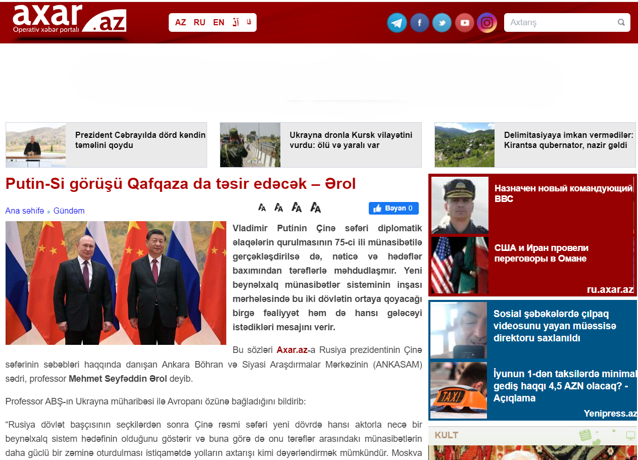 Ankara Kriz ve Siyaset Araştırmaları Merkezi (ANKASAM) Başkanı Prof. Dr. Mehmet Seyfettin Erol, Putin’in Çin Ziyaretine ve Bunun Bölgesel-Küresel Jeopolitik Boyutları’na ilişkin Axar.az’a değerlendirmelerde bulundu. Konuya dair yaptığı değerlendirmede Erol, “Rusya Devlet Başkanı’nın seçimlerden sonra Çin’e yaptığı resmi ziyaret, yeni dönemde uluslararası sistemin hangi aktörünün, nasıl bir hedefinin olduğunu gösteriyor, dolayısıyla bunu bir ilişki kurma yolları arayışı olarak değerlendirmek mümkün.” ifadelerini kullandı. Erol’a göre; Putin ile Şi Cinping arasındaki görüşmelerin ana gündemi çok kutuplu dünyaya karşı bir direniş cephesi oluşturmaktır.