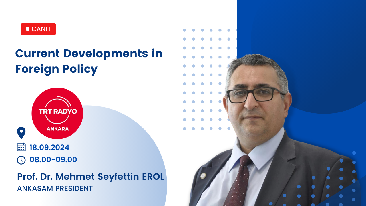 Author: ANKASAM AdminDate:17/09/2024Share:TwitterFacebookLinkedinReddItWhatsAppTelegramEmailPrintCopy URL EVENTSAnnouncementsANKASAM President Prof. Dr. Mehmet Seyfettin EROL is on TRT Ankara Radio! Similar Posts ANKASAM OUTLOOKThe 4+4 Mechanism in Türkiye–Uzbekistan Relations from Strategic Partnership to the Formation of a Geopolitical Axis ANKASAM OUTLOOK“The Forgotten Negotiation Table” in the Russia-Ukraine War: Will the Table in Istanbul Be Set Again? GLOBALPakistani PM: Trump Prevented War in Asia ANKASAM OUTLOOKFuture Prospects in Turkish-American Relations and the “TRC Alliance” CENTRAL ASIABerdymukhamedov in Baku: Azerbaijan and Turkmenistan intensify dialogue on key issuesThis post is also available in: Türkçe Русский📆 18.09.2024⏰ 08.00 – 09.00📍 TRT Ankara RadioANKASAM AdminPrevious articleCURRENT ISSUES IN TURKISH FOREIGN POLICY: “Turkish-American Relations in Changing Global Geopolitics”Next articleANKASAM President Prof. Dr. Mehmet Seyfettin EROL is on TRT Voice of Türkiye Radio!