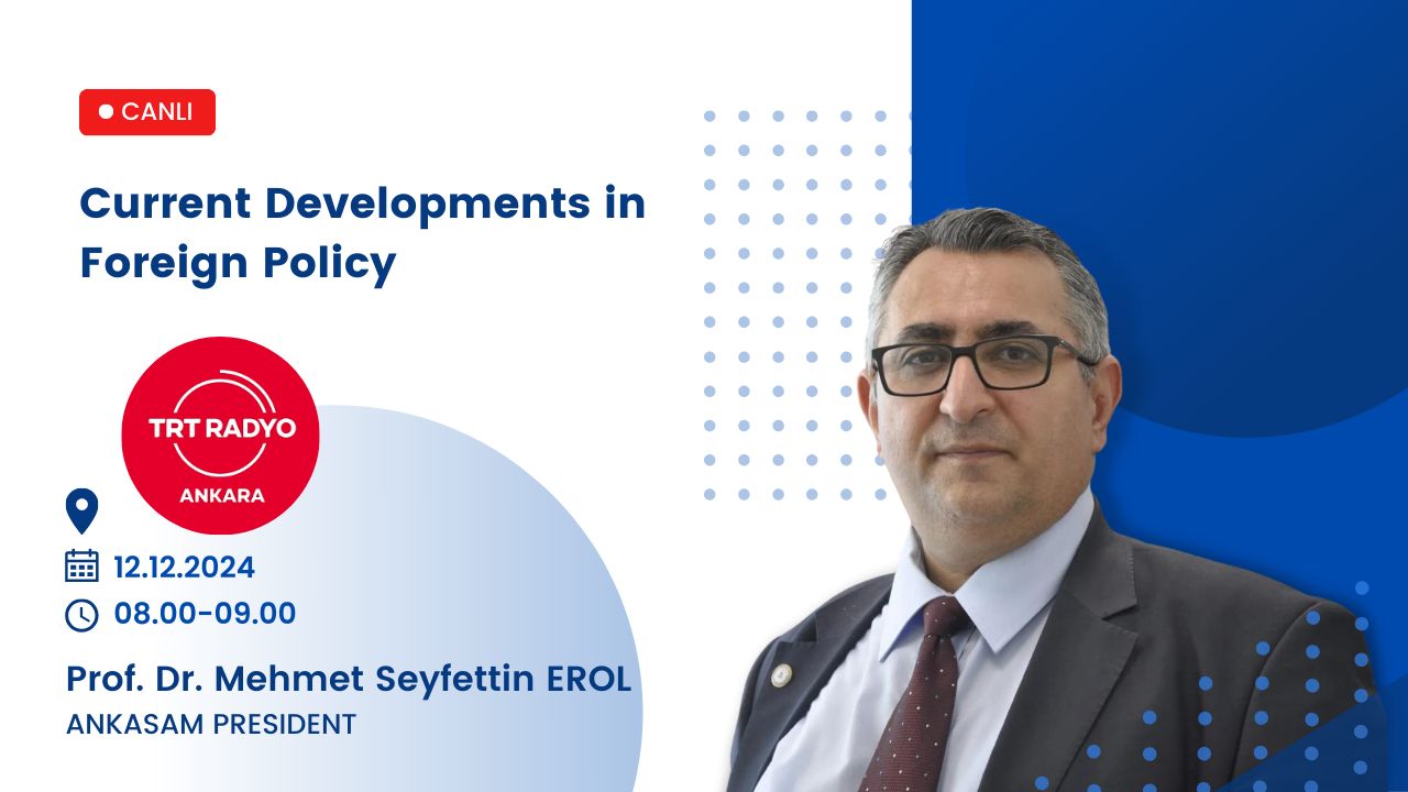 Author: ANKASAM AdminDate:08/12/2024Share:TwitterFacebookLinkedinReddItWhatsAppTelegramEmailPrintCopy URL EVENTSAnnouncementsANKASAM President Prof. Dr. Mehmet Seyfettin EROL is on TRT Ankara Radio! Similar Posts ANKASAM OUTLOOKThe 4+4 Mechanism in Türkiye–Uzbekistan Relations from Strategic Partnership to the Formation of a Geopolitical Axis ANKASAM OUTLOOK“The Forgotten Negotiation Table” in the Russia-Ukraine War: Will the Table in Istanbul Be Set Again? GLOBALPakistani PM: Trump Prevented War in Asia ANKASAM OUTLOOKFuture Prospects in Turkish-American Relations and the “TRC Alliance” CENTRAL ASIABerdymukhamedov in Baku: Azerbaijan and Turkmenistan intensify dialogue on key issuesThis post is also available in: Türkçe Русский📆 12.12.2024⏰ 08.00 – 09.00📍 TRT Ankara RadioANKASAM AdminPrevious articleThe President of ANKASAM Prof. Dr. Mehmet Seyfettin Erol is on A Haber TV!Next articleANKASAM President Prof. Dr. Mehmet Seyfettin EROL is on TRT Voice of Türkiye Radio!