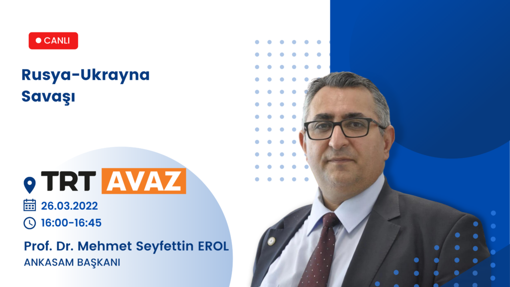 Tarih:25/03/2022Paylaş:TwitterFacebookLinkedinReddItWhatsAppTelegramEmailYazdırCopy URL DuyurularANKASAM Başkanı Prof. Dr. Mehmet Seyfettin EROL, TRT AVAZ’daÖnerilenlerProf. Dr. Mehmet Seyfettin EROL26.03.202216:00-16:45TRT AVAZ, “Ekonomi Politik”Rusya-Ukrayna Savaşıİzlemek için tıklayınızÖnceki İçerikANKASAM Uluslararası İlişkiler Uzmanı Dr. Doğacan Başaran, Kanal B’deSonraki İçerikANKASAM Başkan Başdanışmanı Emekli Büyükelçi Aydın Nurhan, Habertürk TV’de
