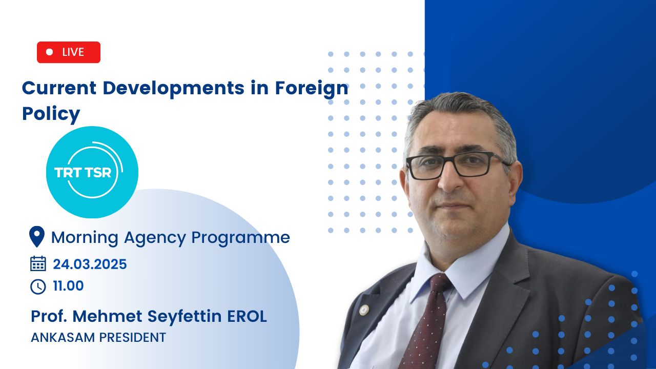 Author: ANKASAM AdminDate:23/03/2025Share:TwitterFacebookLinkedinReddItWhatsAppTelegramEmailPrintCopy URL EVENTSAnnouncementsANKASAM President Prof. Dr. Mehmet Seyfettin EROL is on TRT Voice of Türkiye Radio! Similar Posts GLOBALPakistani PM: Trump Prevented War in Asia ANKASAM OUTLOOKFuture Prospects in Turkish-American Relations and the “TRC Alliance” CENTRAL ASIABerdymukhamedov in Baku: Azerbaijan and Turkmenistan intensify dialogue on key issues EURASIARussia interested in developing ties with Armenia in all areas — Kremlin spokesman EUROPEEU Decides to Lift Economic Sanctions on SyriaThis post is also available in: Türkçe Русский📆 24.03.2025⏰ 11.00📍 TRT Voice of Türkiye RadioANKASAM AdminPrevious articleANKASAM President Prof. Dr. Mehmet Seyfettin Erol is on TRT Ankara Radio!Next articleANKASAM President Prof. Dr. Mehmet Seyfettin Erol is on TRT Ankara Radio!