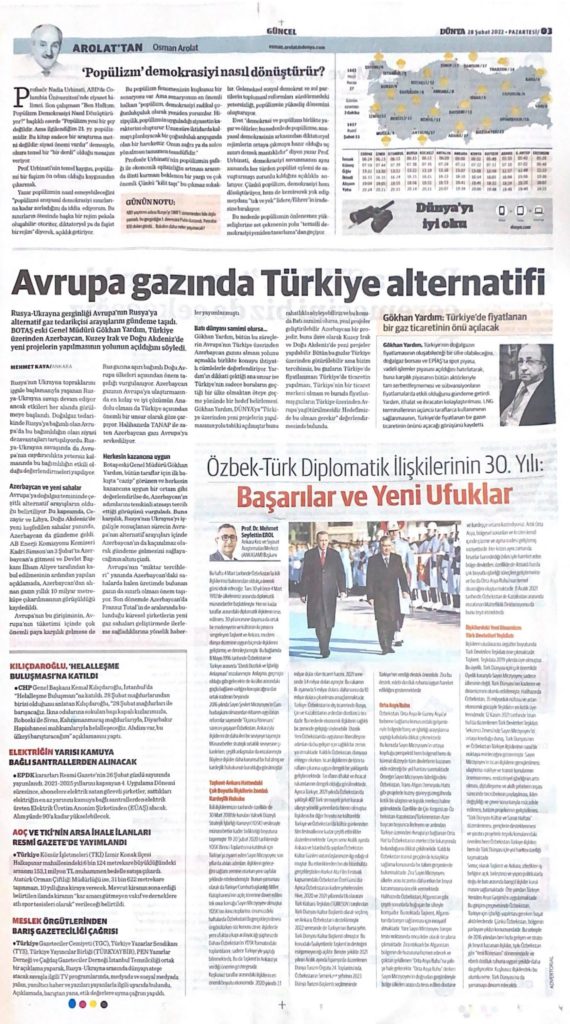 ANKASAM Başkanı Prof. Dr. Mehmet Seyfettin Erol, Türkiye-Özbekistan Diplomatik İlişkilerinin 30. Yılını Dünya Gazetesi’ne Değerlendirdi