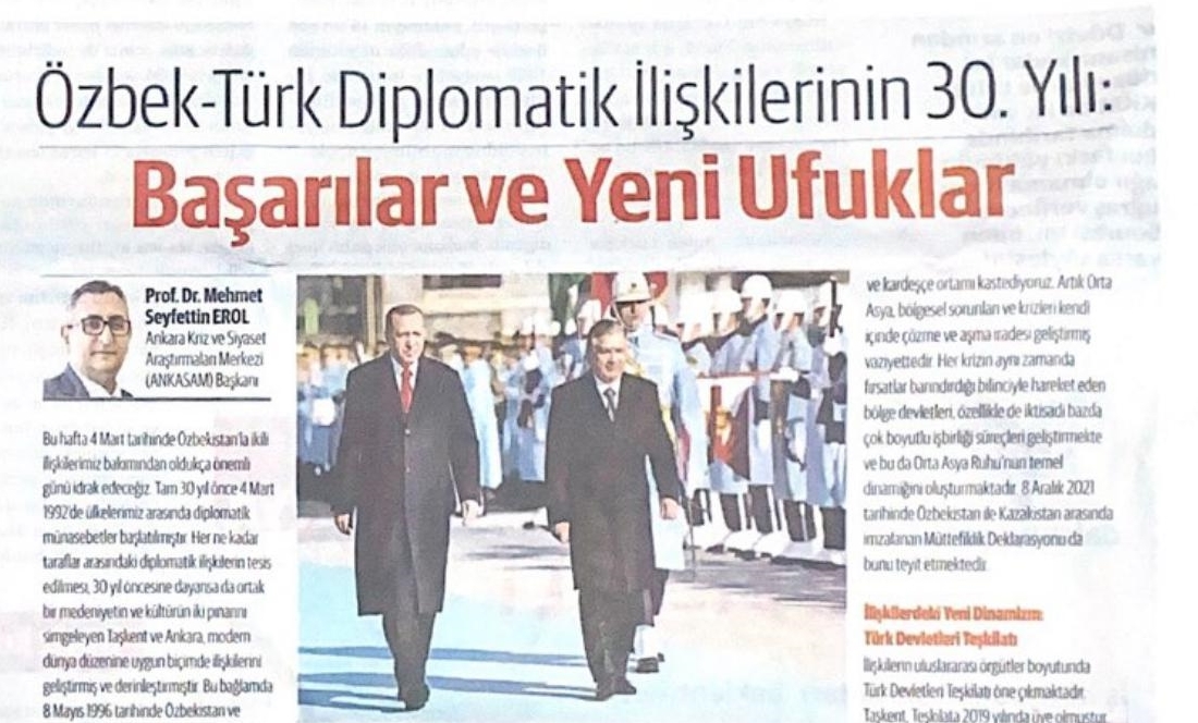 Ankara Kriz ve Siyaset Araştırmaları Merkezi (ANKASAM) Başkanı Prof. Dr. Mehmet Seyfettin Erol, Türkiye-Özbekistan diplomatik ilişkilerinin 30. yılını Dünya Gazetesi’ne değerlendirdi. Türkiye’nin Özbekistan’la 4 Mart 1992 tarihinde başlayan diplomatik ilişkilerin önemine dikkati çeken Erol, “Diplomatik ilişkilerin tesis edilmesi, 30 yıl öncesine dayansa da ortak bir medeniyetin ve kültürün iki pınarını simgeleyen Taşkent ve Ankara, modern dünya düzenine uygun biçimde ilişkilerini geliştirmiş ve derinleştirmiştir.” ifadelerini kullandı. Ayrıca Erol, Özbekistan’ın Orta Asya ile Güney Asya’yı birbirine bağlama konusundaki girişimleriyle bölgede barış ve işbirliği arayışlarına yaptığı katkılarla dikkat çektiğini vurguladı.