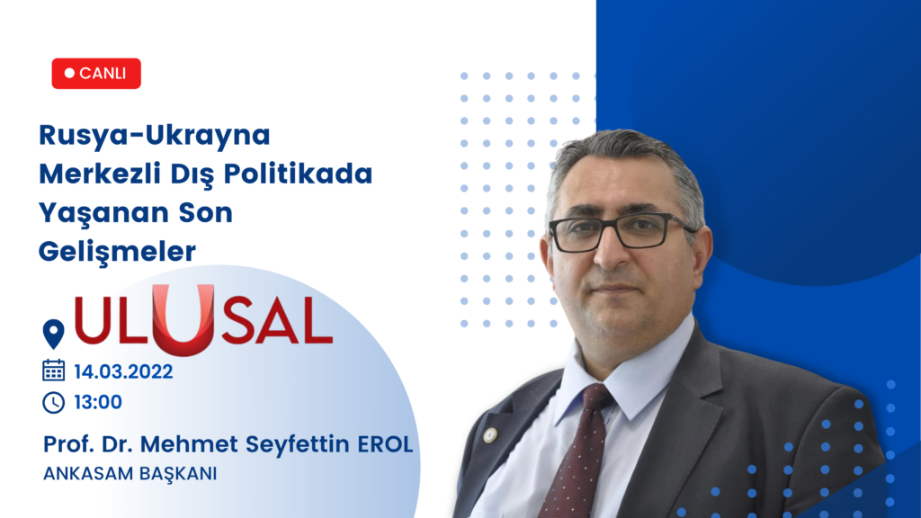 Tarih:13/03/2022Paylaş:TwitterFacebookLinkedinReddItWhatsAppTelegramEmailYazdırCopy URL DuyurularANKASAM Başkanı Prof. Dr. Mehmet Seyfettin EROL, Ulusal Kanal’daÖnerilenler Prof. Dr. Mehmet Seyfettin EROL14.03.202213:00Ulusal Kanal, “Gün Ortası”Rusya-Ukrayna Merkezli Dış Politikada Yaşanan Son Gelişmelerİzlemek için buraya tıklayınızÖnceki İçerikANKASAM Başkan Başdanışmanı Emekli Büyükelçi Aydın Nurhan, Habertürk TV’deSonraki İçerikANKASAM Uzmanı Dr. Doğacan Başaran Rusya-Ukrayna Savaşı’nı On4 TV’ye Değerlendirdi