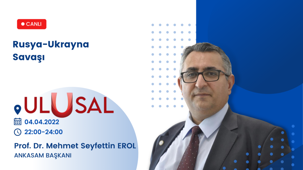 Tarih:04/04/2022Paylaş:TwitterFacebookLinkedinReddItWhatsAppTelegramEmailYazdırCopy URL DuyurularANKASAM Başkanı Prof. Dr. Mehmet Seyfettin EROL, Ulusal Kanal’daÖnerilenler Prof. Dr. Mehmet Seyfettin EROL04.04.202222:00-24:00Ulusal Kanal, “Görüş Alanı”Rusya-Ukrayna Savaşıİzlemek için buraya tıklayınızÖnceki İçerikANKASAM Uluslararası İlişkiler Danışmanı Dr. Kadir Ertaç Çelik Rusya-Ukrayna Savaşı’nı On4 TV’ye DeğerlendirdiSonraki İçerikANKASAM Başkan Başdanışmanı Emekli Büyükelçi Aydın Nurhan, A Haber’de