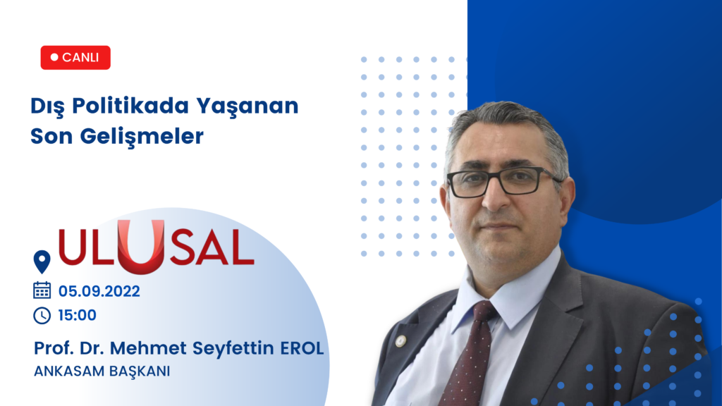 Tarih:03/09/2022Paylaş:TwitterFacebookLinkedinReddItWhatsAppTelegramEmailYazdırCopy URL DuyurularANKASAM Başkanı Prof. Dr. Mehmet Seyfettin Erol, Ulusal Kanal’daÖnerilenler Prof. Dr. Mehmet Seyfettin EROL05.09.202215:00Ulusal Kanal, “Günlük”Dış Politikada Yaşanan Son Gelişmelerİzlemek için buraya tıklayınızÖnceki İçerikANKASAM Başkanı Prof. Dr. Mehmet Seyfettin Erol’un Hürriyet Gazetesi’nde Yayınlanan “Bölgesel ve Küresel İstikrarın Barış Yapıcı Aktörü: Yeni Özbekistan” Başlıklı Yazısı Dunyo Haber Ajansı’nda PaylaşıldıSonraki İçerikANKASAM Başkanı Prof. Dr. Mehmet Seyfettin Erol’un “Güç mücadelesinin diğer adı: ‘Koridorlar’ ve ‘Kenar Kuşak’” Başlıklı Analizi M5 Dergi’de Yayınlandı