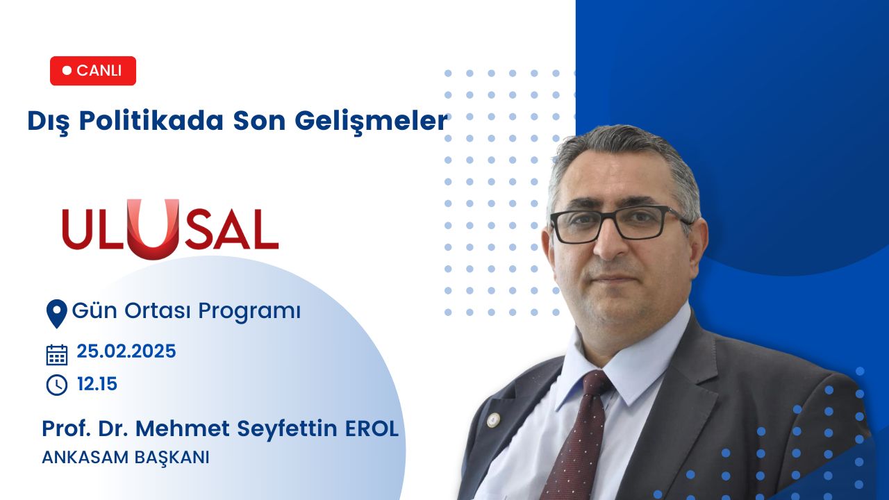 Yazar: ANKASAM AdminTarih:25/02/2025Paylaş:TwitterFacebookLinkedinReddItWhatsAppTelegramEmailYazdırCopy URL ETKİNLİKLERDuyurularANKASAM Başkanı Prof. Dr. Mehmet Seyfettin Erol, Ulusal Kanal’da! Benzer İçerikler ANKASAM BAKIŞTürk-Amerikan İlişkilerinde Gelecek Arayışları ve “TRÇ İttifakı” HABERLERBerdimuhamedov Bakü’de: Azerbaycan ve Türkmenistan önemli konularda diyaloğu hızlandırıyor AVRASYAKremlin Sözcüsü: “Rusya, Ermenistan’la tüm alanlarda ilişkileri geliştirmeye ilgi duyuyor” AVRUPAAB, Suriye’ye yönelik ekonomik yaptırımları kaldırma kararı aldı ASYA-PASİFİKTayland ve Endonezya, İlişkilerini Stratejik Ortaklık Düzeyine YükselttiBu yazı şu dillerde de mevcuttur: English Русский📅 25.02.2025⏰ 12.15📍 Ulusal Kanal TVANKASAM AdminÖnceki İçerikANKASAM Başkanı Prof. Dr. Mehmet Seyfettin Erol, TRT Ankara Radyosu’nda!Sonraki İçerikANKASAM Başkanı Prof. Dr. Mehmet Seyfettin Erol Milliyet Gazetesi’nde İsrail’in Batı Şeria Stratejisi ve Orta Doğu’da Güç Dengesini Değerlendirdi