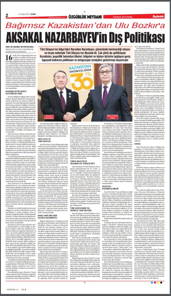 ANKASAM Başkanı Prof. Dr. Mehmet Seyfettin Erol’un “Bağımsız Kazakistan’dan Ulu Bozkır’a Aksakal Nazarbayev’in Dış Politikası” Başlıklı Yazısı Aydınlık Gazetesi’nde
