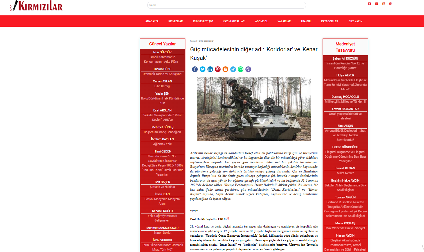Ankara Kriz ve Siyaset Araştırmaları Merkezi (ANKASAM) Başkanı Prof. Dr. Mehmet Seyfettin Erol’un kaleme aldığı “Güç mücadelesinin diğer adı: ‘Koridorlar’ ve ‘Kenar Kuşak’” başlıklı analizi, Kırmızılar’da paylaşıldı. Erol yazısında, “Artan aktör sayısı, coğrafyayı çok geniş bir alana yaydığı gibi, ilişkiler ağını da karışık bir hale getiriyor. Bu noktada Rusya-Ukrayna Savaşı’nın sadece Doğu Avrupa’yı değil, Arktiklerden başlayıp Hazar hatta Orta Asya’ya kadar uzanan bir hattı hedef aldığını görüyoruz. Burada Doğu Avrupa sadece Avrasya bazlı değil, Arktikler bazlı bir güç mücadelesinin de merkez alanını oluşturuyor.” ifadelerine yer vermişti.