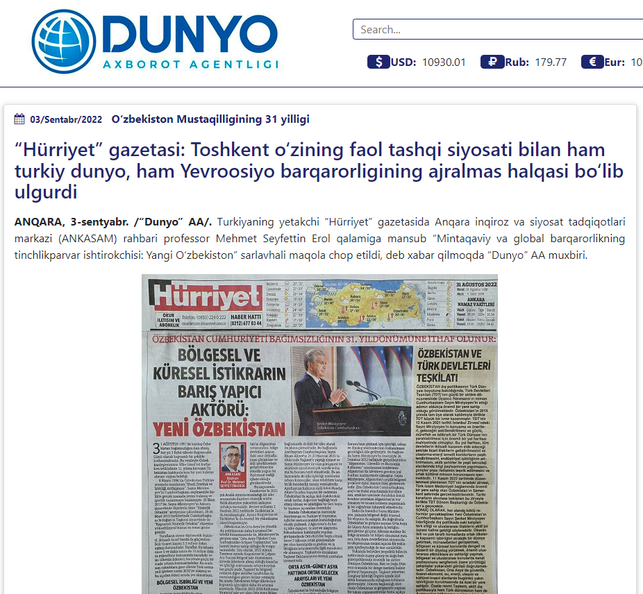 ANKASAM Başkanı Prof. Dr. Mehmet Seyfettin Erol’un Hürriyet Gazetesi’nde Yayınlanan “Bölgesel ve Küresel İstikrarın Barış Yapıcı Aktörü: Yeni Özbekistan” Başlıklı Yazısı Dunyo Haber Ajansı’nda Paylaşıldı