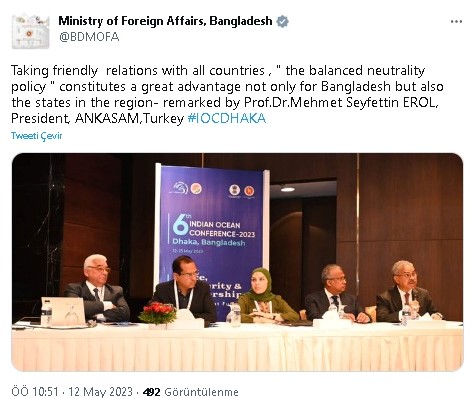 Ankara Kriz ve Siyaset Araştırmaları Merkezi (ANKASAM) Başkanı Prof. Dr. Mehmet Seyfettin Erol’un “Orta, Güney ve Güneydoğu Asya Jeopolitik Hattında Güçlü bir Geleceğin Üç Kilit Kavramı: “Barış”, “Refah” ve “Ortaklık” başlıklı sunumunda yer alan ifadeler Bangladeş Dışişleri Bakanlığı tarafından paylaşıldı. Söz konusu paylaşımda Bangladeş Dışişleri Bakanlığı, Erol’un Bangladeş’in “dengeli tarafsızlık” politikasının bölgesel ve küresel jeopolitik için taşıdığı öneme yaptığı vurguyu ön plana çıkardı.
