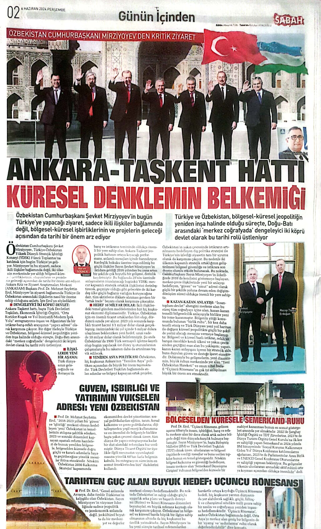 Date:06/06/2024Share:TwitterFacebookLinkedinReddItWhatsAppTelegramEmailPrintCopy URL AnnouncementsANKASAM President Prof. M. S. EROL’s assessment of Uzbekistan President Mr. Mirziyoyev’s visit to Turkey was published in Sabah Newspaper. Recommended AnnouncementsANKASAM President Prof. Dr. Mehmet Seyfettin EROL on TRT Ankara Radio! AnnouncementsANKASAM President Prof. Dr. Mehmet Seyfettin EROL on TRT Voice of Türkiye Radio! AnnouncementsANKASAM President Prof. Mehmet Seyfettin EROL on Baku TV!This post is also available in: Türkçe РусскийANKASAM President Prof. Mehmet Seyfettin EROL’s assessment of Uzbekistan President Mr. Şevket Mirziyoyev’s visit to Türkiye titled “Ankara-Tashkent Line: The Backbone of the Global Equation” was published in Sabah Newspaper.Previous articleANKASAM International Relations Consultant Dr. Kadir Ertaç ÇELİK on Akit TV!Next articleANKASAM President Prof. Dr. Mehmet Seyfettin EROL is on TRT Voice of Türkiye Radio!