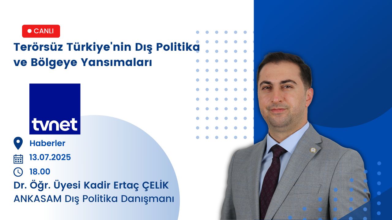 Yazar: ANKASAM AdminTarih:13/07/2025Paylaş:TwitterFacebookLinkedinReddItWhatsAppTelegramEmailYazdırCopy URL ETKİNLİKLERDuyurularANKASAM Dış Politika Danışmanı Dr. Öğr. Üyesi Kadir Ertaç Çelik, TVNET’de! Benzer İçerikler ANKASAM BAKIŞTürk-Amerikan İlişkilerinde Gelecek Arayışları ve “TRÇ İttifakı” HABERLERBerdimuhamedov Bakü’de: Azerbaycan ve Türkmenistan önemli konularda diyaloğu hızlandırıyor AVRASYAKremlin Sözcüsü: “Rusya, Ermenistan’la tüm alanlarda ilişkileri geliştirmeye ilgi duyuyor” AVRUPAAB, Suriye’ye yönelik ekonomik yaptırımları kaldırma kararı aldı ASYA-PASİFİKTayland ve Endonezya, İlişkilerini Stratejik Ortaklık Düzeyine YükselttiBu yazı şu dillerde de mevcuttur: English Русский📆 13.07.2025⏰ 18.00📍 TVNETANKASAM AdminÖnceki İçerikANKASAM Uluslararası İlişkiler Danışmanı Dr. Öğr. Üyesi Kadir Ertaç Çelik TRT Arabi’de!Sonraki İçerikANKASAM Başkanı Prof. Dr. Mehmet Seyfettin Erol TRT Türkiye’nin Sesi Radyosu’nda!