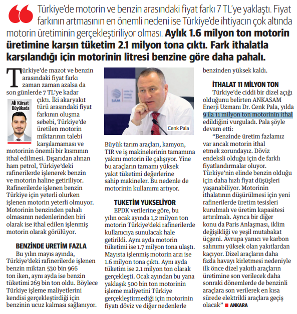 Ankara Kriz ve Siyaset Araştırmaları Merkezi (ANKASAM) Enerji Başdanışmanı Dr. Cenk Pala, Türkiye’deki akaryakıt fiyatlarını Yeni Şafak Gazetesi’ne değerlendirdi. Türkiye’de benzin ve motorin arasındaki fiyat farkına ilişkin konuşan Pala, iki akaryakıt türü arasındaki fiyat farkının Türkiye’de üretilen motorin miktarının talebi karşılamaması ve motorinin önemli bir kısmının ithal edilmesinden kaynaklandığını söyledi. Pala, “Benzinde üretim fazlamız var; ancak motorin ithal etmek zorundayız. Döviz endeksli olduğu için de farklı fiyatlandırmalar oluyor. Türkiye’nin elinde benzin olduğu için daha hızlı fiyat düşüşleri yaşanabiliyor. Motorinin ithalatının düşürülmesi için yeni rafinerilerde üretim tesisleri kurulmalı ve üretim kapasitesi artırılmalı.” ifadelerini kullandı.