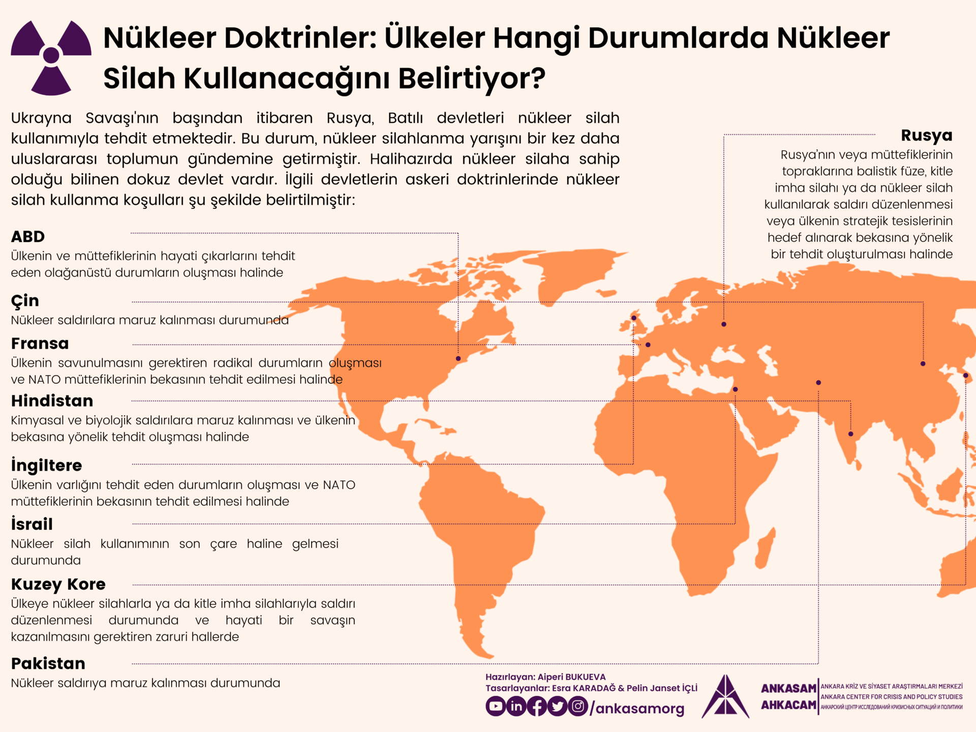 Yazar: Editör EditörTarih:03/10/2022Paylaş:TwitterFacebookLinkedinReddItWhatsAppTelegramEmailYazdırCopy URL İnfografikANKASAM İnfografik: Nükleer Doktrinler: Ülkeler Hangi Durumlarda Nükleer Silah Kullanacağını Belirtiyor? Benzer İçerikler ANKASAM BAKIŞTürk-Amerikan İlişkilerinde Gelecek Arayışları ve “TRÇ İttifakı” HABERLERBerdimuhamedov Bakü’de: Azerbaycan ve Türkmenistan önemli konularda diyaloğu hızlandırıyor AVRASYAKremlin Sözcüsü: “Rusya, Ermenistan’la tüm alanlarda ilişkileri geliştirmeye ilgi duyuyor” AVRUPAAB, Suriye’ye yönelik ekonomik yaptırımları kaldırma kararı aldı ASYA-PASİFİKTayland ve Endonezya, İlişkilerini Stratejik Ortaklık Düzeyine YükselttiBu yazı şu dillerde de mevcuttur: English РусскийEditör EditörÖnceki İçerikANKASAM İnfografik: İtalya’nın Yeni Başbakanı Giorgia Meloni Kimdir?Sonraki İçerikANKASAM İnfografik: Bulgaristan Genel Seçimleri