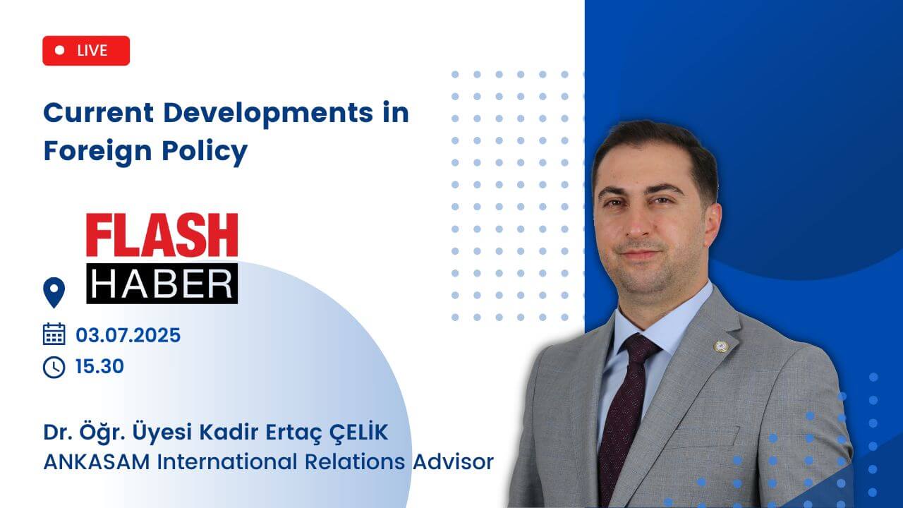 Author: ANKASAM AdminDate:03/07/2025Share:TwitterFacebookLinkedinReddItWhatsAppTelegramEmailPrintCopy URL AnnouncementsANKASAM International Relations Advisor Dr. Kadir Ertaç Çelik, Assistant Professor, on Flash Haber TV! Similar Posts GLOBALPakistani PM: Trump Prevented War in Asia ANKASAM OUTLOOKFuture Prospects in Turkish-American Relations and the “TRC Alliance” CENTRAL ASIABerdymukhamedov in Baku: Azerbaijan and Turkmenistan intensify dialogue on key issues EURASIARussia interested in developing ties with Armenia in all areas — Kremlin spokesman EUROPEEU Decides to Lift Economic Sanctions on SyriaThis post is also available in: Türkçe Русский📆 03.07.2025⏰ 15.30📍 Flash Haber TVANKASAM AdminPrevious articleANKASAM Senior Advisor Prof. Dr. Cem Karadeli Assessed the Power Struggle in the Black Sea Basin on Ulusal KanalNext articleANKASAM President Prof. Dr. Mehmet Seyfettin Erol on the Voice of Türkiye Radio!