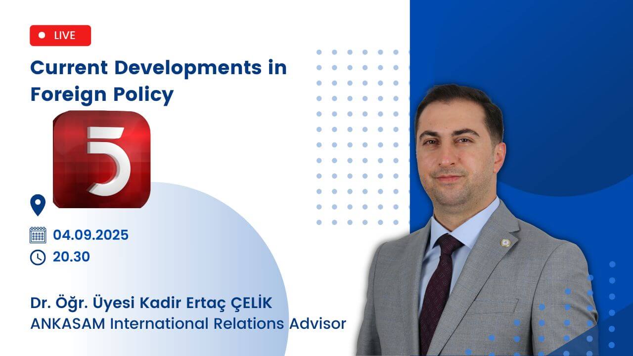 Author: ANKASAM AdminDate:04/09/2025Share:TwitterFacebookLinkedinReddItWhatsAppTelegramEmailPrintCopy URL AnnouncementsANKASAM International Relations Advisor Dr. Kadir Ertaç Çelik on TV5! Similar Posts GLOBALPakistani PM: Trump Prevented War in Asia ANKASAM OUTLOOKFuture Prospects in Turkish-American Relations and the “TRC Alliance” CENTRAL ASIABerdymukhamedov in Baku: Azerbaijan and Turkmenistan intensify dialogue on key issues EURASIARussia interested in developing ties with Armenia in all areas — Kremlin spokesman EUROPEEU Decides to Lift Economic Sanctions on SyriaThis post is also available in: Türkçe Русский📆 04.09.2025⏰ 20.30📍 TV5ANKASAM AdminPrevious articleANKASAM President Prof. Dr. Mehmet Seyfettin Erol on TRT Türkiye’s Voice Radio!Next articleANKASAM President Prof. Dr. Mehmet Seyfettin Erol on AZTV!