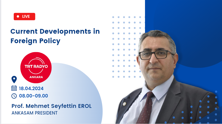 Author: ANKASAM AdminDate:17/04/2024Share:TwitterFacebookLinkedinReddItWhatsAppTelegramEmailPrintCopy URL EVENTSAnnouncementsANKASAM President Prof. Dr. Mehmet Seyfettin EROL is on TRT Ankara Radio! Similar Posts GLOBALPakistani PM: Trump Prevented War in Asia ANKASAM OUTLOOKFuture Prospects in Turkish-American Relations and the “TRC Alliance” CENTRAL ASIABerdymukhamedov in Baku: Azerbaijan and Turkmenistan intensify dialogue on key issues EURASIARussia interested in developing ties with Armenia in all areas — Kremlin spokesman EUROPEEU Decides to Lift Economic Sanctions on SyriaThis post is also available in: Türkçe Русский📅 18.04.2024⏰ 08.00-09.00📍 TRT Ankara RadioANKASAM AdminPrevious articleANKASAM Chief Advisor to the President Retired Ambassador Aydın NURHAN at A Haber!Next articleANKASAM President Prof. Dr. Mehmet Seyfettin EROL is on TRT Ankara Radio!