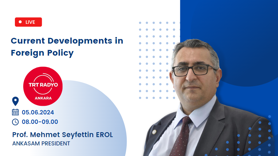 Author: ANKASAM AdminDate:04/06/2024Share:TwitterFacebookLinkedinReddItWhatsAppTelegramEmailPrintCopy URL EVENTSAnnouncementsANKASAM President Prof. Dr. Mehmet Seyfettin EROL is on TRT Ankara Radio! Similar Posts GLOBALPakistani PM: Trump Prevented War in Asia ANKASAM OUTLOOKFuture Prospects in Turkish-American Relations and the “TRC Alliance” CENTRAL ASIABerdymukhamedov in Baku: Azerbaijan and Turkmenistan intensify dialogue on key issues EURASIARussia interested in developing ties with Armenia in all areas — Kremlin spokesman EUROPEEU Decides to Lift Economic Sanctions on SyriaThis post is also available in: Türkçe Русский📅 05.06.2024⏰ 08.00-09.00📍 TRT Ankara RadioANKASAM AdminPrevious articleANKASAM International Relations Expert Göktuğ ÇALIŞKAN is on TRT Radio News!Next articleANKASAM International Relations Consultant Dr. Kadir Ertaç ÇELİK on Akit TV!