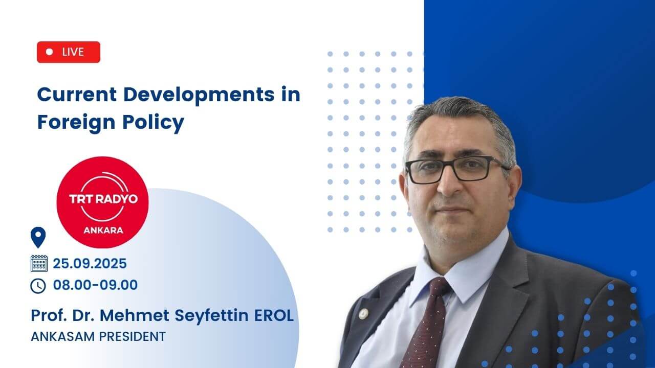 Author: ANKASAM AdminDate:24/09/2025Share:TwitterFacebookLinkedinReddItWhatsAppTelegramEmailPrintCopy URL AnnouncementsANKASAM President Prof. Dr. Mehmet Seyfettin Erol on TRT Ankara Radio! Similar Posts GLOBALPakistani PM: Trump Prevented War in Asia ANKASAM OUTLOOKFuture Prospects in Turkish-American Relations and the “TRC Alliance” CENTRAL ASIABerdymukhamedov in Baku: Azerbaijan and Turkmenistan intensify dialogue on key issues EURASIARussia interested in developing ties with Armenia in all areas — Kremlin spokesman EUROPEEU Decides to Lift Economic Sanctions on SyriaThis post is also available in: Türkçe Русский🗓️ 25.09.2025⏰ 08.00📍 TRT Ankara Radio📻 Agenda ProgramANKASAM AdminPrevious articleANKASAM President Prof. Dr. Mehmet Seyfettin Erol on AZTV!Next articleANKASAM President Prof. Dr. Mehmet Seyfettin Erol on TRT Voice of Türkiye Radio!