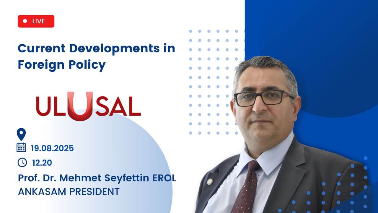 Author: ANKASAM AdminDate:18/08/2025Share:TwitterFacebookLinkedinReddItWhatsAppTelegramEmailPrintCopy URL AnnouncementsANKASAM President Prof. Dr. Mehmet Seyfettin Erol on Ulusal Kanal! Similar Posts GLOBALPakistani PM: Trump Prevented War in Asia ANKASAM OUTLOOKFuture Prospects in Turkish-American Relations and the “TRC Alliance” CENTRAL ASIABerdymukhamedov in Baku: Azerbaijan and Turkmenistan intensify dialogue on key issues EURASIARussia interested in developing ties with Armenia in all areas — Kremlin spokesman EUROPEEU Decides to Lift Economic Sanctions on SyriaThis post is also available in: Türkçe Русский🗓️ 19.08.2025⏰ 12.20📍 Ulusal Kanal📺 Pulse of the AgendaANKASAM AdminPrevious articleANKASAM President Prof. Dr. Mehmet Seyfettin Erol Assessed the Alaska Talks Between Trump and Putin on AZTVNext articleANKASAM President Prof. Dr. Mehmet Seyfettin Erol Evaluates the Alaska Summit and Process on Oxu.Az