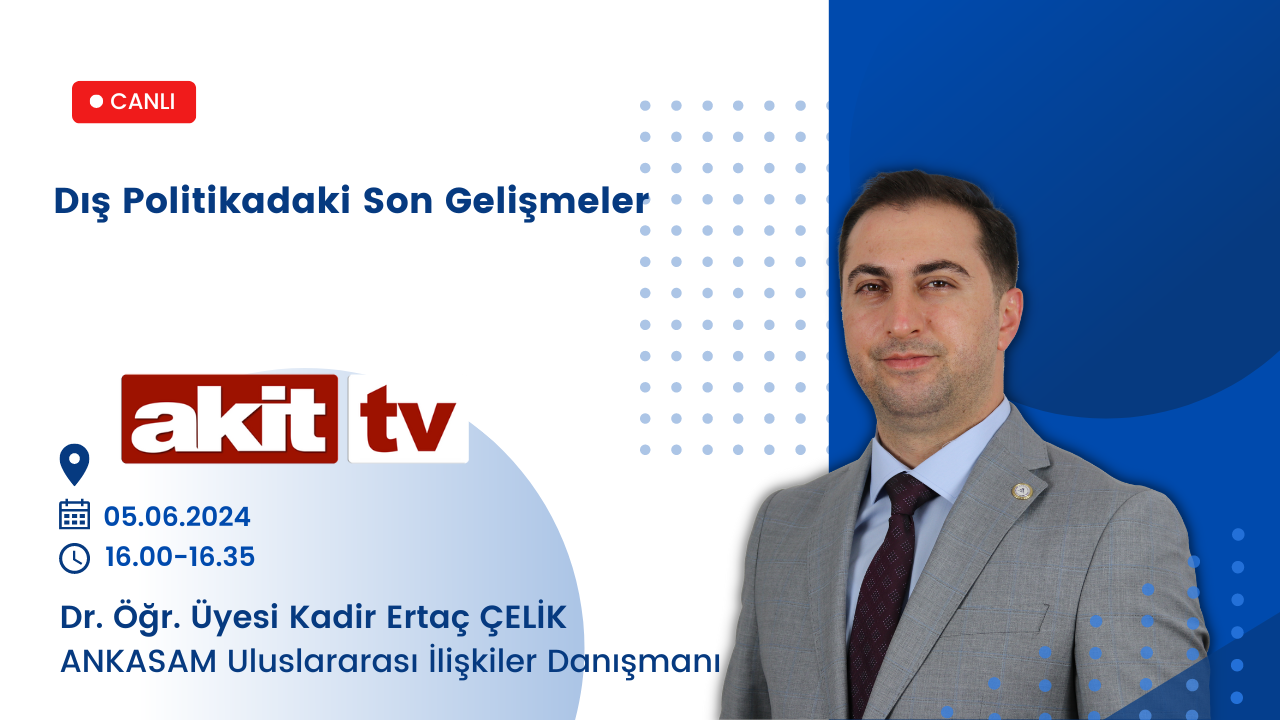 Yazar: ANKASAM AdminTarih:05/06/2024Paylaş:TwitterFacebookLinkedinReddItWhatsAppTelegramEmailYazdırCopy URL ETKİNLİKLERDuyurularANKASAM Uluslararası İlişkiler Danışmanı Dr. Kadir Ertaç ÇELİK Akit TV’de! Benzer İçerikler ANKASAM BAKIŞTürkiye-Özbekistan İlişkilerinde Stratejik Ortaklıktan Jeopolitik Eksen Oluşumuna 4+4 Mekanizması ANKASAM BAKIŞRusya-Ukrayna Savaşında “Unutulan Müzakere Masası”: İstanbul’da Masa Tekrar Kurulacak mı? ANKASAM BAKIŞTürk-Amerikan İlişkilerinde Gelecek Arayışları ve “TRÇ İttifakı” HABERLERBerdimuhamedov Bakü’de: Azerbaycan ve Türkmenistan önemli konularda diyaloğu hızlandırıyor AVRASYAKremlin Sözcüsü: “Rusya, Ermenistan’la tüm alanlarda ilişkileri geliştirmeye ilgi duyuyor”Bu yazı şu dillerde de mevcuttur: English Русский📅 05.06.2024⏰ 16.00-16.35📍 Akit TVANKASAM AdminÖnceki İçerikANKASAM Başkanı Prof. Dr. Mehmet Seyfettin EROL, TRT Ankara Radyosu’nda!Sonraki İçerikANKASAM Başkanı Prof. M. S. EROL’un Özbekistan Cumhurbaşkanı Sayın Mirziyoyev’in Türkiye ziyareti kapsamında yapmış olduğu değerlendirme Sabah Gazetesi’nde yayımlanmıştır.