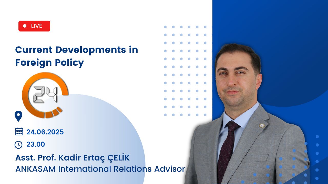 Author: ANKASAM AdminDate:24/06/2025Share:TwitterFacebookLinkedinReddItWhatsAppTelegramEmailPrintCopy URL EVENTSAnnouncementsANKASAM International Relations Advisor Dr. Kadir Ertaç Çelik is on 24TV! Similar Posts GLOBALPakistani PM: Trump Prevented War in Asia ANKASAM OUTLOOKFuture Prospects in Turkish-American Relations and the “TRC Alliance” CENTRAL ASIABerdymukhamedov in Baku: Azerbaijan and Turkmenistan intensify dialogue on key issues EURASIARussia interested in developing ties with Armenia in all areas — Kremlin spokesman EUROPEEU Decides to Lift Economic Sanctions on SyriaThis post is also available in: Türkçe Русский📆 24.06.2025⏰ 23.00📍 24TVANKASAM AdminPrevious articleANKASAM International Relations Advisor Dr. Kadir Ertaç Çelik is on Ülke TV!Next articleANKASAM President Prof. Dr. Mehmet Seyfettin Erol on A Haber!