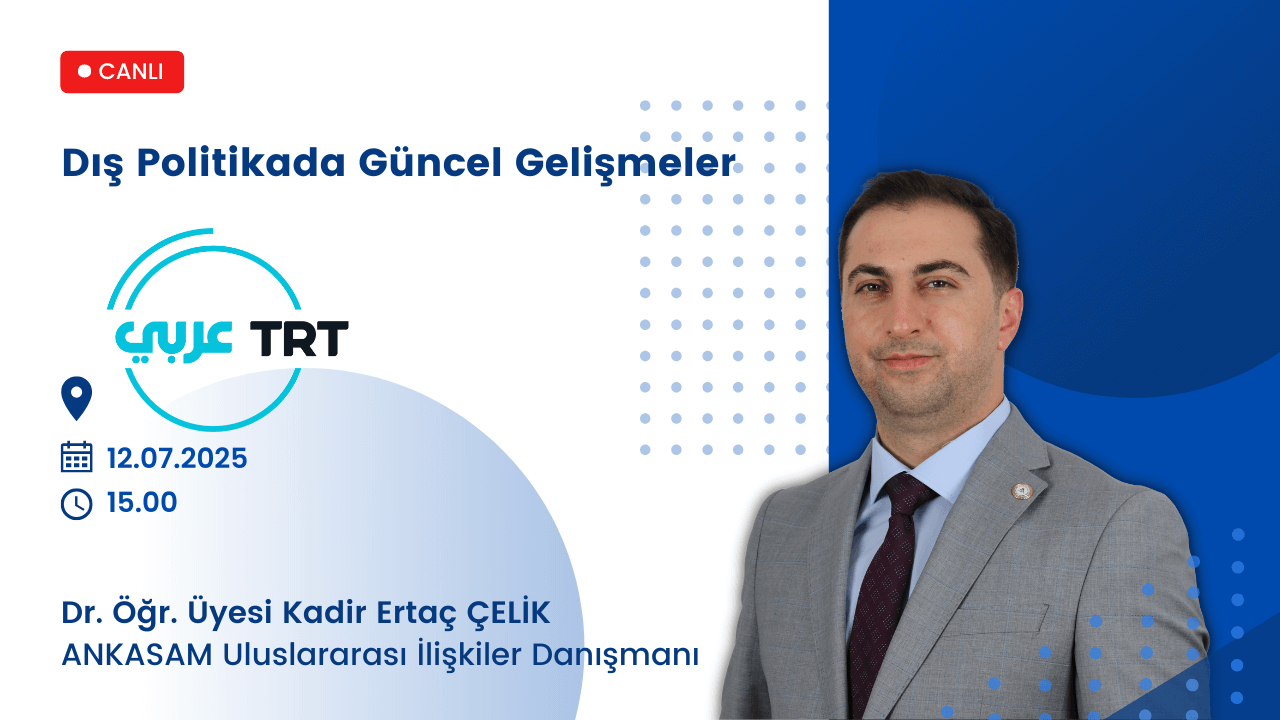Yazar: ANKASAM AdminTarih:12/07/2025Paylaş:TwitterFacebookLinkedinReddItWhatsAppTelegramEmailYazdırCopy URL DuyurularANKASAM Uluslararası İlişkiler Danışmanı Dr. Öğr. Üyesi Kadir Ertaç Çelik TRT Arabi’de! Benzer İçerikler ANKASAM BAKIŞTürk-Amerikan İlişkilerinde Gelecek Arayışları ve “TRÇ İttifakı” HABERLERBerdimuhamedov Bakü’de: Azerbaycan ve Türkmenistan önemli konularda diyaloğu hızlandırıyor AVRASYAKremlin Sözcüsü: “Rusya, Ermenistan’la tüm alanlarda ilişkileri geliştirmeye ilgi duyuyor” AVRUPAAB, Suriye’ye yönelik ekonomik yaptırımları kaldırma kararı aldı ASYA-PASİFİKTayland ve Endonezya, İlişkilerini Stratejik Ortaklık Düzeyine YükselttiBu yazı şu dillerde de mevcuttur: English Русский🗓️ 12.07.2025⏰ 15.00📍 TRT ArabiANKASAM AdminÖnceki İçerikANKASAM Başkanı Prof. Dr. Mehmet Seyfettin Erol AZTV’de!Sonraki İçerikANKASAM Dış Politika Danışmanı Dr. Öğr. Üyesi Kadir Ertaç Çelik, TVNET’de!