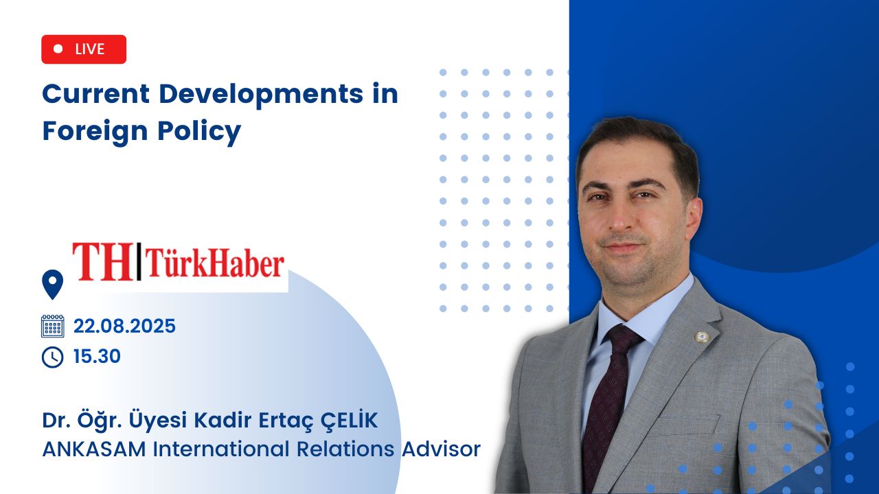 Author: ANKASAM AdminDate:22/08/2025Share:TwitterFacebookLinkedinReddItWhatsAppTelegramEmailPrintCopy URL EVENTSAnnouncementsANKASAM International Relations Advisor Dr. Kadir Ertaç Çelik on Türkhaber TV! Similar Posts GLOBALPakistani PM: Trump Prevented War in Asia ANKASAM OUTLOOKFuture Prospects in Turkish-American Relations and the “TRC Alliance” CENTRAL ASIABerdymukhamedov in Baku: Azerbaijan and Turkmenistan intensify dialogue on key issues EURASIARussia interested in developing ties with Armenia in all areas — Kremlin spokesman EUROPEEU Decides to Lift Economic Sanctions on SyriaThis post is also available in: Türkçe Русский📆 22.08.2025⏰ 15.30📍 Türkhaber TVANKASAM AdminPrevious articleANKASAM President Prof. Dr. Mehmet Seyfettin Erol Evaluated the Alaska Summit in Ekonomi NewspaperNext articleANKASAM President Prof. Dr. Mehmet Seyfettin Erol Assesses Trump’s Two-Week Ultimatum to Russia on ED News