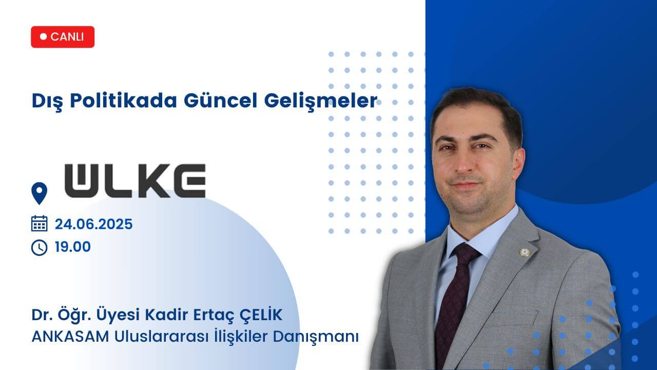 Yazar: ANKASAM AdminTarih:24/06/2025Paylaş:TwitterFacebookLinkedinReddItWhatsAppTelegramEmailYazdırCopy URL DuyurularANKASAM Uluslararası İlişkiler Danışmanı Dr. Öğr. Üyesi Kadir Ertaç Çelik, Ülke TV’de! Benzer İçerikler ANKASAM BAKIŞTürk-Amerikan İlişkilerinde Gelecek Arayışları ve “TRÇ İttifakı” HABERLERBerdimuhamedov Bakü’de: Azerbaycan ve Türkmenistan önemli konularda diyaloğu hızlandırıyor AVRASYAKremlin Sözcüsü: “Rusya, Ermenistan’la tüm alanlarda ilişkileri geliştirmeye ilgi duyuyor” AVRUPAAB, Suriye’ye yönelik ekonomik yaptırımları kaldırma kararı aldı ASYA-PASİFİKTayland ve Endonezya, İlişkilerini Stratejik Ortaklık Düzeyine YükselttiBu yazı şu dillerde de mevcuttur: English Русский🗓️ 24.06.2025 ⏰ 19.00📍 Ülke TVANKASAM AdminÖnceki İçerikANKASAM Başkanı Prof. Dr. Mehmet Seyfettin Erol AZ TV’de ABD, İsrail ve İran Çerçevesinde Dış Politikada Güncel Gelişmeleri DeğerlendirdiSonraki İçerikANKASAM Uluslararası İlişkiler Danışmanı Dr. Öğr. Üyesi Kadir Ertaç Çelik, 24TV’de!