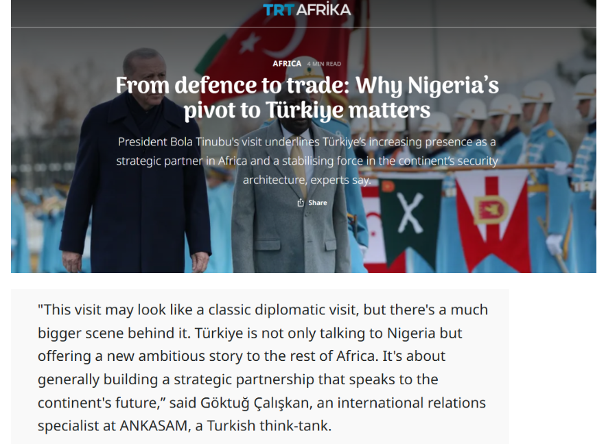 ANKASAM Uluslararası İlişkiler Uzmanı Göktuğ Çalışkan, “Bu ziyaret klasik bir diplomatik temas gibi görünebilir; ancak arka planında çok daha büyük bir tablo bulunmaktadır. Türkiye yalnızca Nijerya ile görüşmüyor, aynı zamanda Afrika’nın geri kalanına yönelik yeni ve iddialı bir hikâye sunuyor. Bu, genel olarak kıtanın geleceğine hitap eden stratejik bir ortaklık inşa etmeye dayanıyor” ifadelerini kullanmıştır.