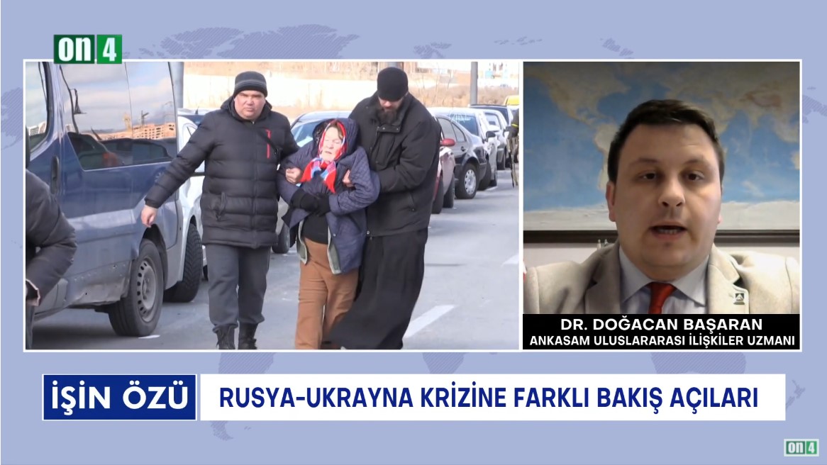 Ankara Kriz ve Siyaset Araştırmaları Merkezi (ANKASAM) Uzmanı Dr. Doğacan Başaran, On4 TV’de Muhammed Acar’ın sunuculuğunu yaptığı İşin Özü programında Rusya-Ukrayna Savaşı’na yönelik değerlendirmelerde bulundu. Rusya’nın Ukrayna saldırısının uluslararası hukukun ihlal edilmesi anlamına geldiğini vurgulayan Başaran, her şeye rağmen müzakere kanalının açık olmasının değerli olduğunu belirtti.
