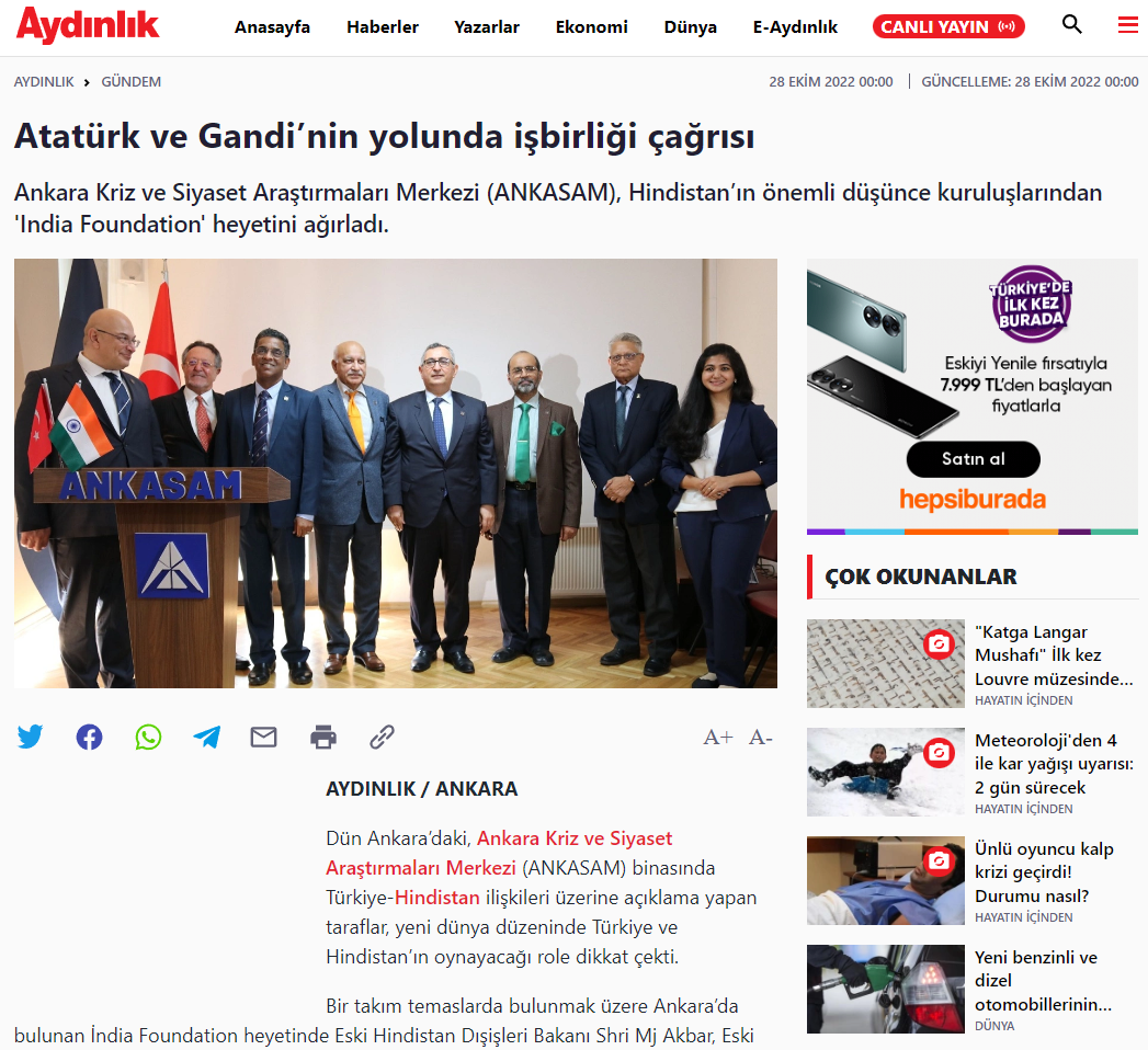 Ankara Kriz ve Siyaset Araştırmaları Merkezi’nin (ANKASAM) düzenlediği “Değişen Uluslararası Konjonktürde Türkiye-Hindistan İlişkilerinde Yeni Dönem” konulu seminer Aydınlık Gazetesi’nde yayınlandı. ANKASAM Başkanı Prof. Dr. Mehmet Seyfettin Erol, Eski Hindistan Dışişleri Bakanı Shri M.J. Akbar ve India Foundation Direktörü Alok Bansal’ın konuşmacı olduğu konferansta, Türkiye-Hindistan ilişkileri konuşuldu.