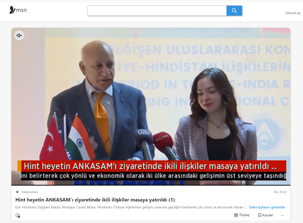 Ankara Kriz ve Siyaset Araştırmaları Merkezi’nin (ANKASAM) düzenlediği “Değişen Uluslararası Konjonktürde Türkiye-Hindistan İlişkilerinde Yeni Dönem” konulu seminer Msn’de yayınlandı. ANKASAM Başkanı Prof. Dr. Mehmet Seyfettin Erol, Eski Hindistan Dışişleri Bakanı Shri M.J. Akbar ve India Foundation Direktörü Alok Bansal’ın konuşmacı olduğu konferansta, Türkiye-Hindistan ilişkileri konuşuldu.