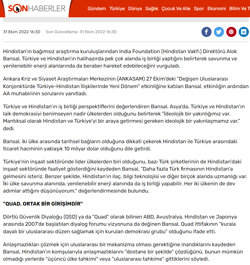 Ankara Kriz ve Siyaset Araştırmaları Merkezi’nin (ANKASAM) düzenlediği “Değişen Uluslararası Konjonktürde Türkiye-Hindistan İlişkilerinde Yeni Dönem” konulu seminer Son Haberler portalında yayınlandı. ANKASAM Başkanı Prof. Dr. Mehmet Seyfettin Erol, Eski Hindistan Dışişleri Bakanı Shri M.J. Akbar ve India Foundation Direktörü Alok Bansal’ın konuşmacı olduğu konferansta, Türkiye-Hindistan ilişkileri konuşuldu.