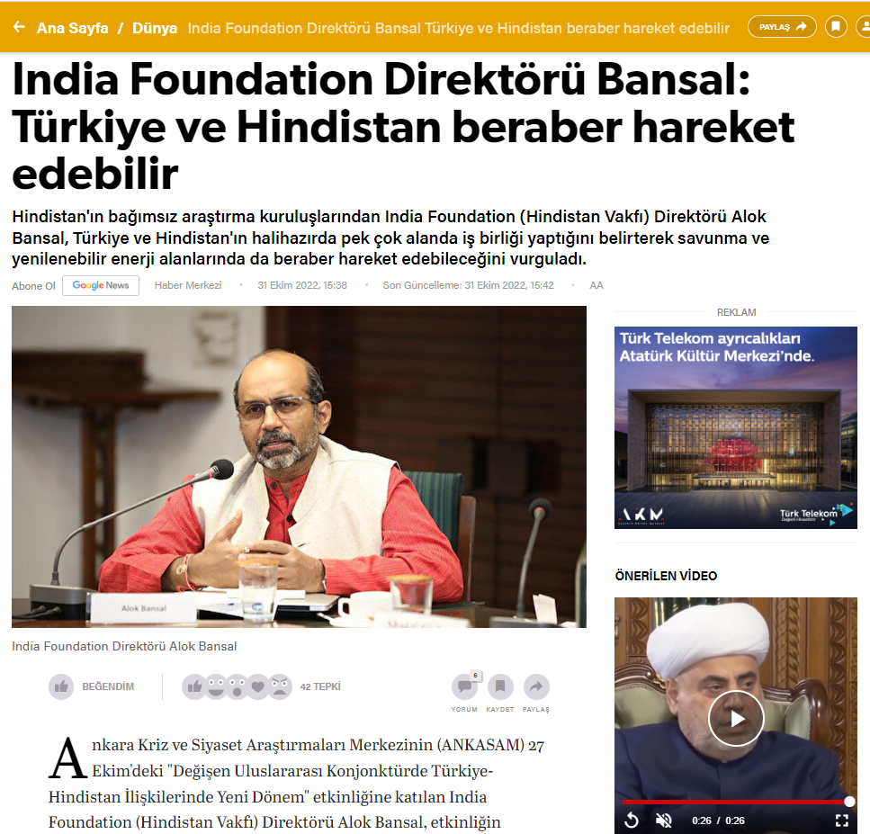 Ankara Kriz ve Siyaset Araştırmaları Merkezi’nin (ANKASAM) düzenlediği “Değişen Uluslararası Konjonktürde Türkiye-Hindistan İlişkilerinde Yeni Dönem” konulu seminer Yeni Şafak Gazetesi’nde yayınlandı. ANKASAM Başkanı Prof. Dr. Mehmet Seyfettin Erol, Eski Hindistan Dışişleri Bakanı Shri M.J. Akbar ve India Foundation Direktörü Alok Bansal’ın konuşmacı olduğu konferansta, Türkiye-Hindistan ilişkileri konuşuldu.