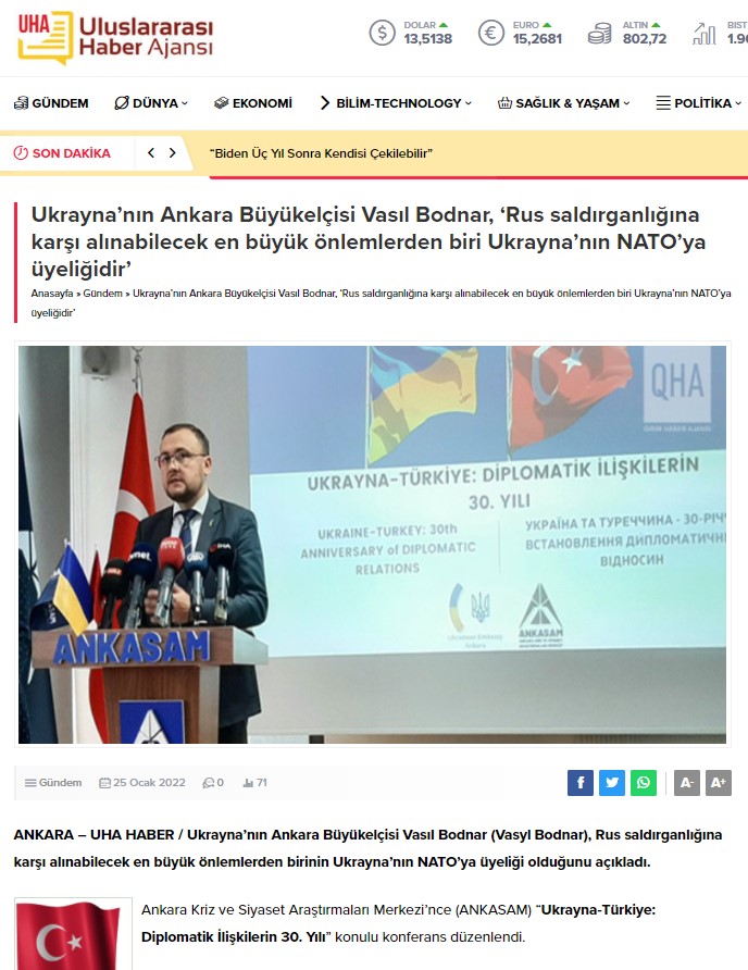 ANKASAM’ın düzenlediği Ukrayna-Türkiye: Diplomatik İlişkilerin 30. Yılı Konferansı Uluslararası Haber Ajansı’nda yayınlandı.