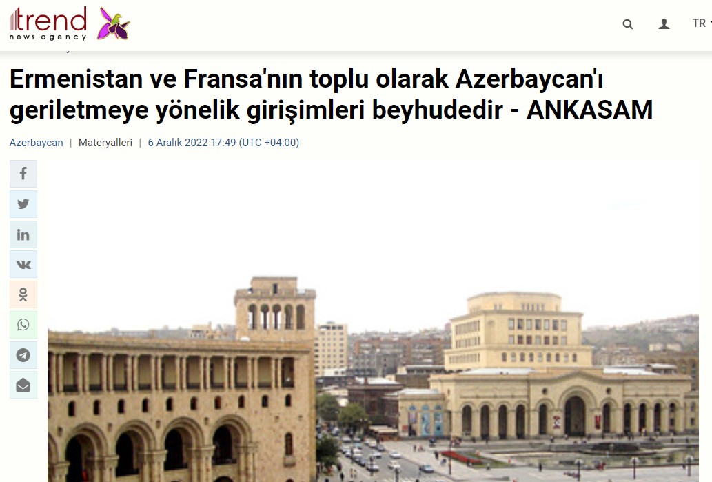 Ankara Kriz ve Siyaset Araştırmaları Merkezi (ANKASAM) tarafından yayınlanan analizlerde yer alan Ermenistan’ın Azerbaycan’la yürüttüğü müzakere sürecine Fransa’yı dahil etme çabalarına ilişkin tespitlere, Azerbaycan merkezli Trend Haber Ajansı’nda yer verildi. Söz konusu haberde ANKASAM’ın “Ermenistan Başbakanı Nikol Paşinyan, Azerbaycan’la yürütülen müzakere süreçlerine Fransa’yı dahil etmeye çalışmaktadır. Fransa ise bölgedeki tek arabulucu aktör haline gelmek istemekte ve Moskova’nın barış anlaşması konusundaki çabalarının yetersiz olduğunu kanıtlamak istemektedir.” değerlendirmesine atıfta bulunuldu.