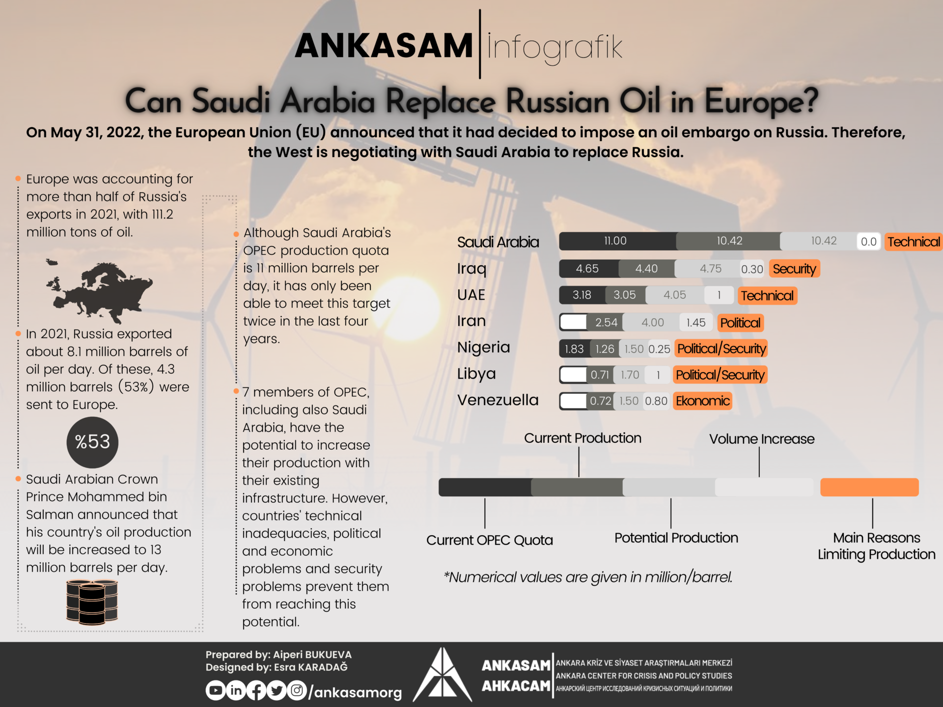 Author: Editör EditörDate:22/07/2022Share:TwitterFacebookLinkedinReddItWhatsAppTelegramEmailPrintCopy URL INFOGRAPHICSCan Saudi Arabia Replace Russian Oil in Europe? Similar Posts ANKASAM OUTLOOKThe 4+4 Mechanism in Türkiye–Uzbekistan Relations from Strategic Partnership to the Formation of a Geopolitical Axis ANKASAM OUTLOOK“The Forgotten Negotiation Table” in the Russia-Ukraine War: Will the Table in Istanbul Be Set Again? GLOBALPakistani PM: Trump Prevented War in Asia ANKASAM OUTLOOKFuture Prospects in Turkish-American Relations and the “TRC Alliance” CENTRAL ASIABerdymukhamedov in Baku: Azerbaijan and Turkmenistan intensify dialogue on key issuesThis post is also available in: Türkçe РусскийEditör EditörPrevious articleAn infographic collection on the most basic norms foreseen in the draft constitutional law of the Republic of Uzbekistan “On Amendments and Addenda to the Constitution of the Republic of Uzbekistan” prepared by Development Strategy Center was published in ANKASAM.Next articleANKASAM Infographic: Sri Lanka’s New President Ranil Wickremesinghe