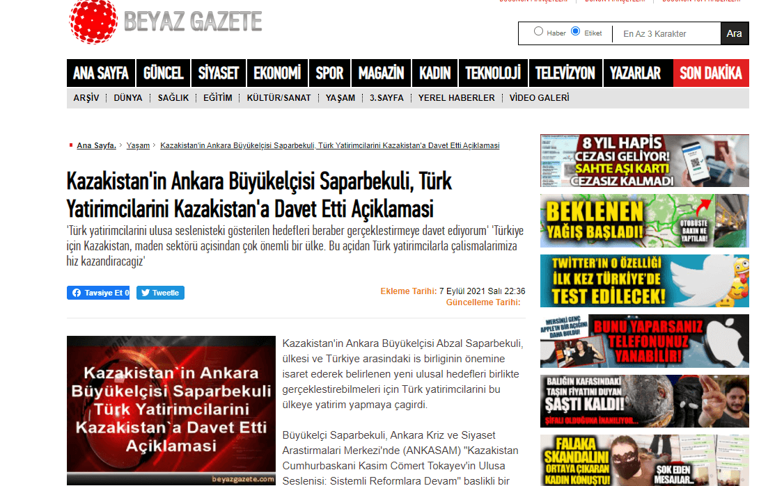 Ankara Kriz ve Siyaset Araştırmaları Merkezi’nin 07.09.2021 tarihinde düzenlemiş olduğu, Kassym-Jomart Tokayev’in Ulusa Seslenişi üzerine organize edilen etkinlikte, Kazakistan Ankara Büyükelçisi Abzal Saparbekuly “Kazakistan Cumhurbaşkanı Kassym-Jomart Tokayev’in Ulusa Seslenişi: Sistemli Reformlara Devam” başlıklı konuşma yaptı.