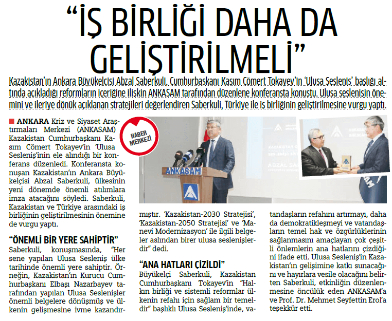 Ankara Kriz ve Siyaset Araştırmaları Merkezi’nin 07.09.2021 tarihinde düzenlemiş olduğu, Kassym-Jomart Tokayev’in Ulusa Seslenişi üzerine organize edilen etkinlikte, Kazakistan Ankara Büyükelçisi Abzal Saparbekuly “Kazakistan Cumhurbaşkanı Kassym-Jomart Tokayev’in Ulusa Seslenişi: Sistemli Reformlara Devam” başlıklı konuşma yaptı.