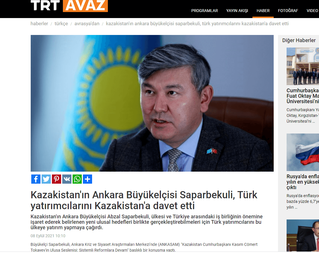 Ankara Kriz ve Siyaset Araştırmaları Merkezi’nin 07.09.2021 tarihinde düzenlemiş olduğu, Kassym-Jomart Tokayev’in Ulusa Seslenişi üzerine organize edilen etkinlikte, Kazakistan Ankara Büyükelçisi Abzal Saparbekuly “Kazakistan Cumhurbaşkanı Kassym-Jomart Tokayev’in Ulusa Seslenişi: Sistemli Reformlara Devam” başlıklı konuşma yaptı.