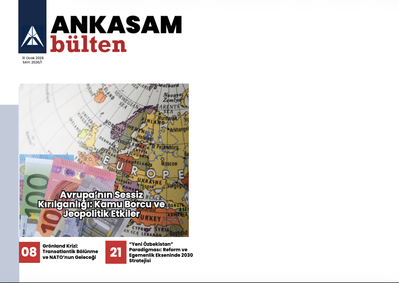 1 Ocak – 31 Ocak 2026 tarihleri arasında ANKASAM tarafından gerçekleştirilen faaliyetlerin sizlere toplu şekilde sunulduğu Aylık Bülten yayımlanmıştır. ANKASAM Aylık Bülten’de; analizler, ANKASAM Bakış değerlendirmeleri ile ANKASAM danışman ve uzmanlarının medya faaliyetleri yer almaktadır.