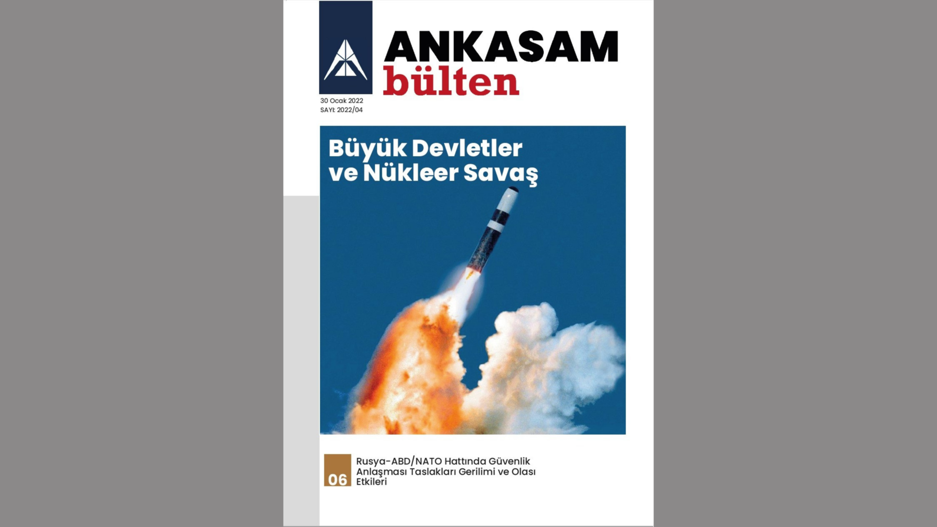 24-30 Ocak 2022 tarihleri arasında ANKASAM tarafından gerçekleştirilen faaliyetlerin sizlere toplu bir şekilde sunulduğu Haftalık Bülten yayımlanmıştır. ANKASAM Haftalık Bülten’de; haftanın bütün analizleri, ANKASAM Bakış değerlendirmeleri ile ANKASAM danışman ve uzmanlarının medya faaliyetleri yer almaktadır.